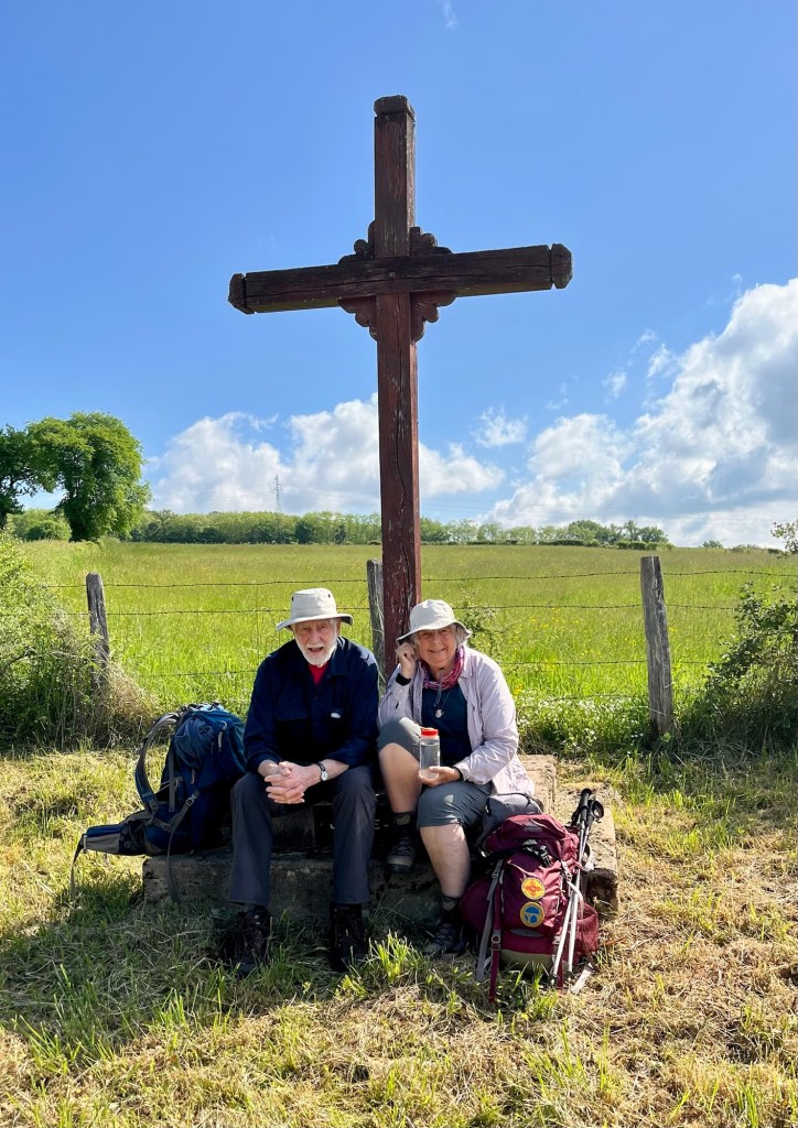 We took a break on the steps of a roadside cross. Alain came along as we were sitting there and took our picture.