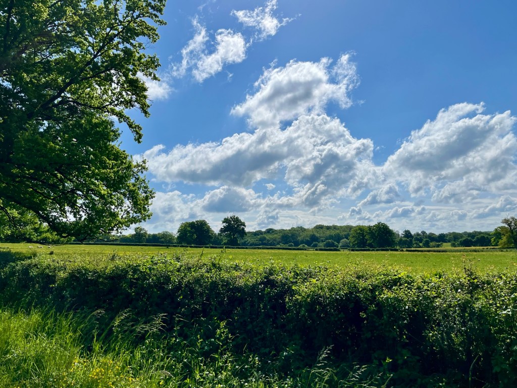 We saw a small red fox in the low marshy spot just before we climbed up here last night, heard many birds and spied our first magpies of the walk. We’ve encountered lots of white cows who eye us with great curiosity, a runaway lamb, and two horses today.