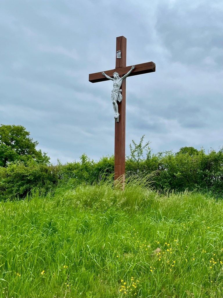 We came to an intersection with a cross and dirt tracks crossing the road marked by a Compostelle marker that pointed at an ambiguous angle.