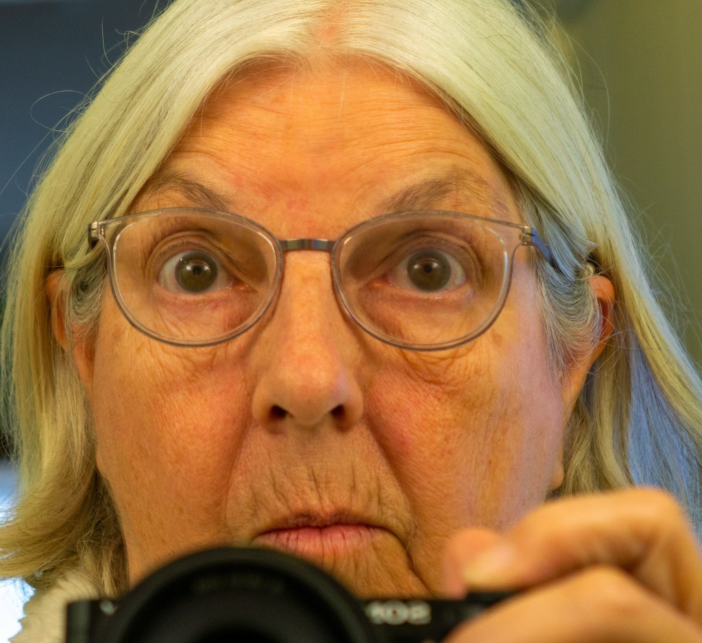 Finally, I was called and guided into the pre-op location, where I was told to lie down on a gurney. I hesitated to put my shoes on the clean white blankets but did as I was told. I must say that all the people who came to administer various procedures were warm, friendly and caring. Since we were all masked, and since I cannot hear well if I can’t see, they were very patient with me, repeating themselves until I could understand them. They put a needle for an IV on the back of my hand and slapped an eye patch over my left eye, after verifying more than once my name and which eye would be operated on. They put various drops in my right eye, one of which stung (they warmed me!) and told me keep my eyes closed. A sticker was pasted on my forehead over the right eye — the one to be operated on. Various sticky things were stuck onto my chest and waist (I’d been told to wear a shirt that buttoned — not my usual winter attire), then I had to push myself up to the top of the bed, which got my clothes a bit out of arrangement and left me with what felt like a log under my back. The helpful attendant adjusted the bed to be more comfortable and at my request reached under my shirt and pulled the slipped bra strap back into place. A cap covered up my hair, the wisps were swept out of my eyes, and then I was swaddled tightly in the blankets, arms at my side. I’d been a bit fearful about getting cold, but I was not.